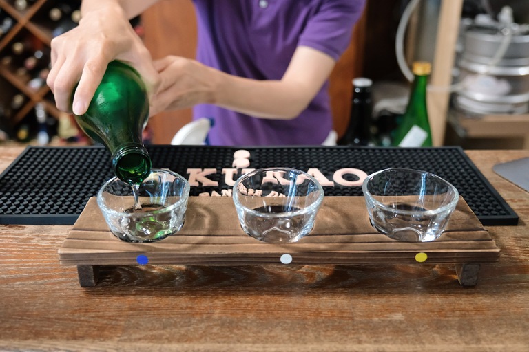 Set of three glasses of local sake for 500 yen at Sakamotoya Liquor Store