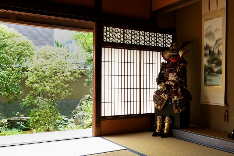 A samurai armor on display in a traditional house.