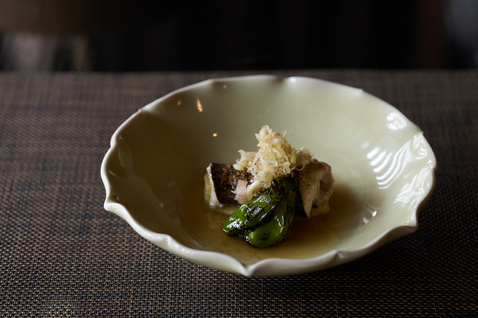 A ginger-infused rice cake wrapped in steamed eggplant and conger eel.