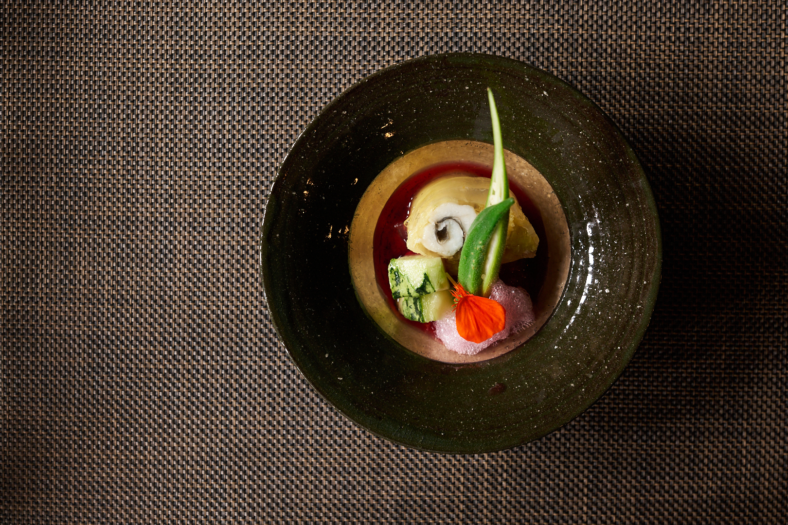 Zucchini, young corn, and pickled melon, accompanied by pike conger jelly. The dish is dressed with a sauce made of tomato and plum paste reduced in red wine, offering a delightful texture.