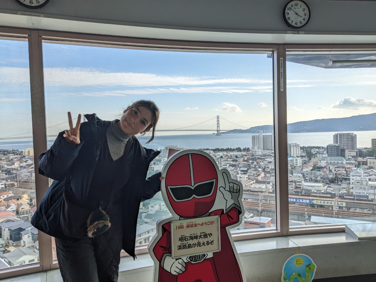 From the observation deck, which has windows covering 360 degrees, you can see the Akashi-Kaikyo Bridge, ships passing through the Akashi Strait, Awaji Island, and more. The panoramic view of Akashi city, Mt. Rokko, and the skyscrapers of Nishi-Kobe showed us the charm of Akashi that goes beyond its natural beauty.