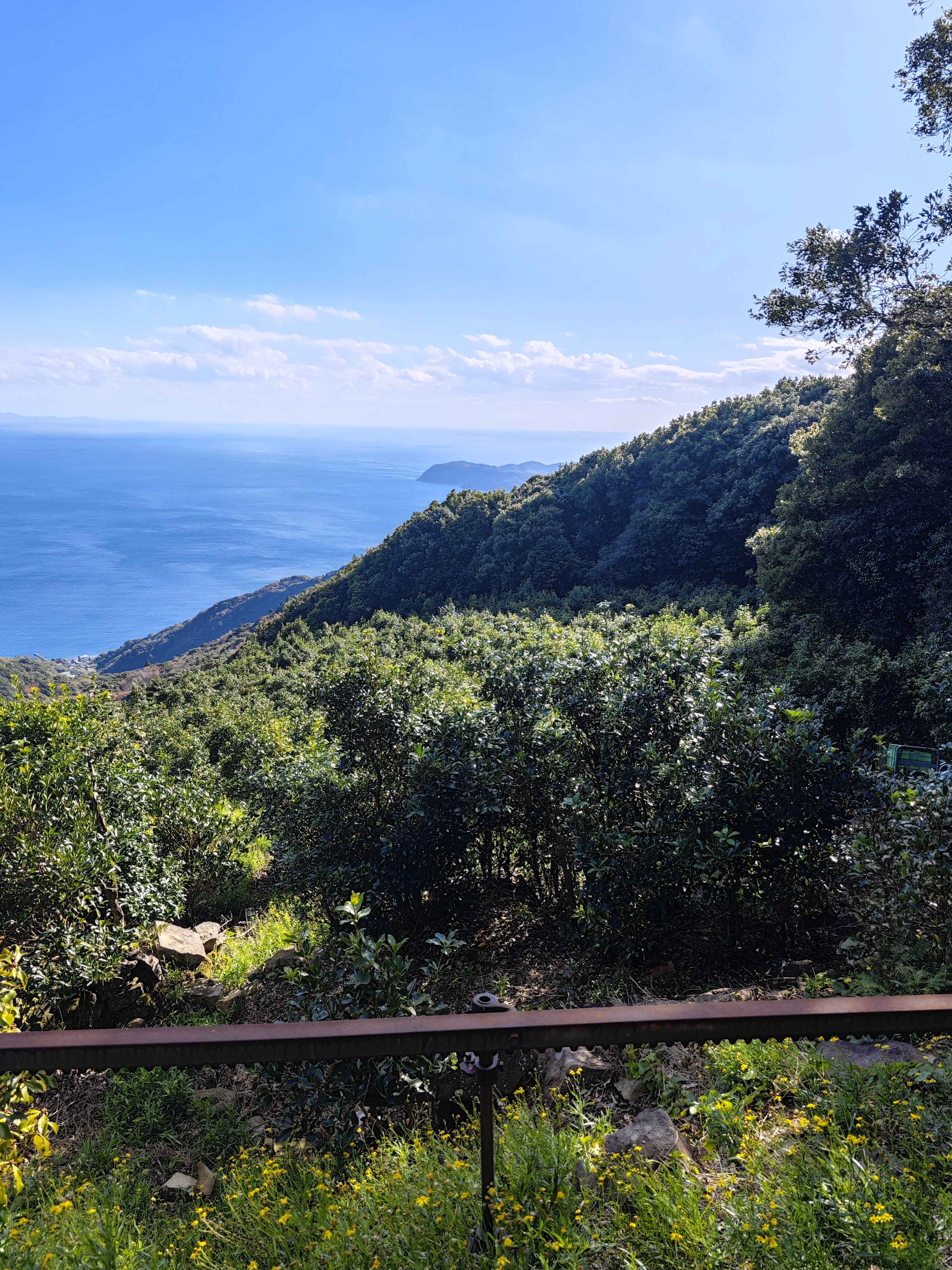 From the summit, you can see far beyond the sea, a wonderful view! The calm blue sea of the Seto Inland Sea spreads out below, with islands scattered beyond. The boundary line between the sea and the sky was softly melting.