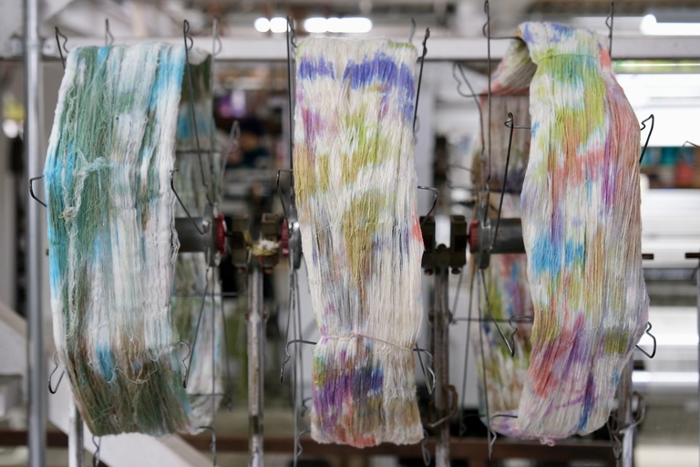 Walking through the Lab, I was able to witness every step of the process—dyeing, weaving, sewing, and finishing. Rows of brightly colored threads lined the walls, each waiting its turn to become fabric. In the background, vintage looms from the last century clattered away, filling the air with a steady, rhythmic soundtrack as the cloth slowly took shape.